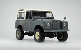 The main body and hood are painted in a specially selected matte finish paint, and in a very retro looking "Welsh Grey" color. In addition, each one is individually hand painted for special weathering finishes. Each one is unique. To contrast this, the removable roof is painted white and the true beadlock wheels are off white and are accompanied by realistic 95mm AT-SS Soft compound tires.